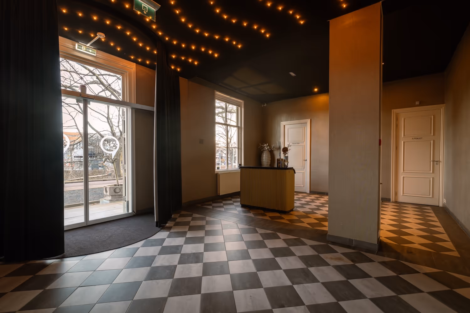 De foyer is een sfeervolle ruimte en vormt een gastvrije ontvangstruimte voor verschillendeevenementen. Dankzij de flexibele opstelling is de ruimte geschikt voor borrels, feesten, recepties,walking dinners en workshops. De hoge plafonds, authentieke details en goede akoestiek makendeze ruimte tot een dynamische en multifunctionele plek.Licht, ruimtelijk en met directe toegang tot buiten